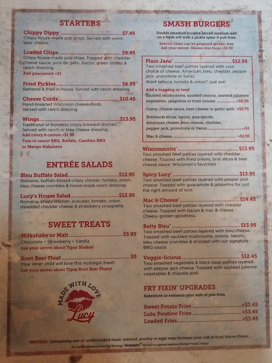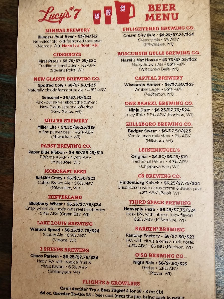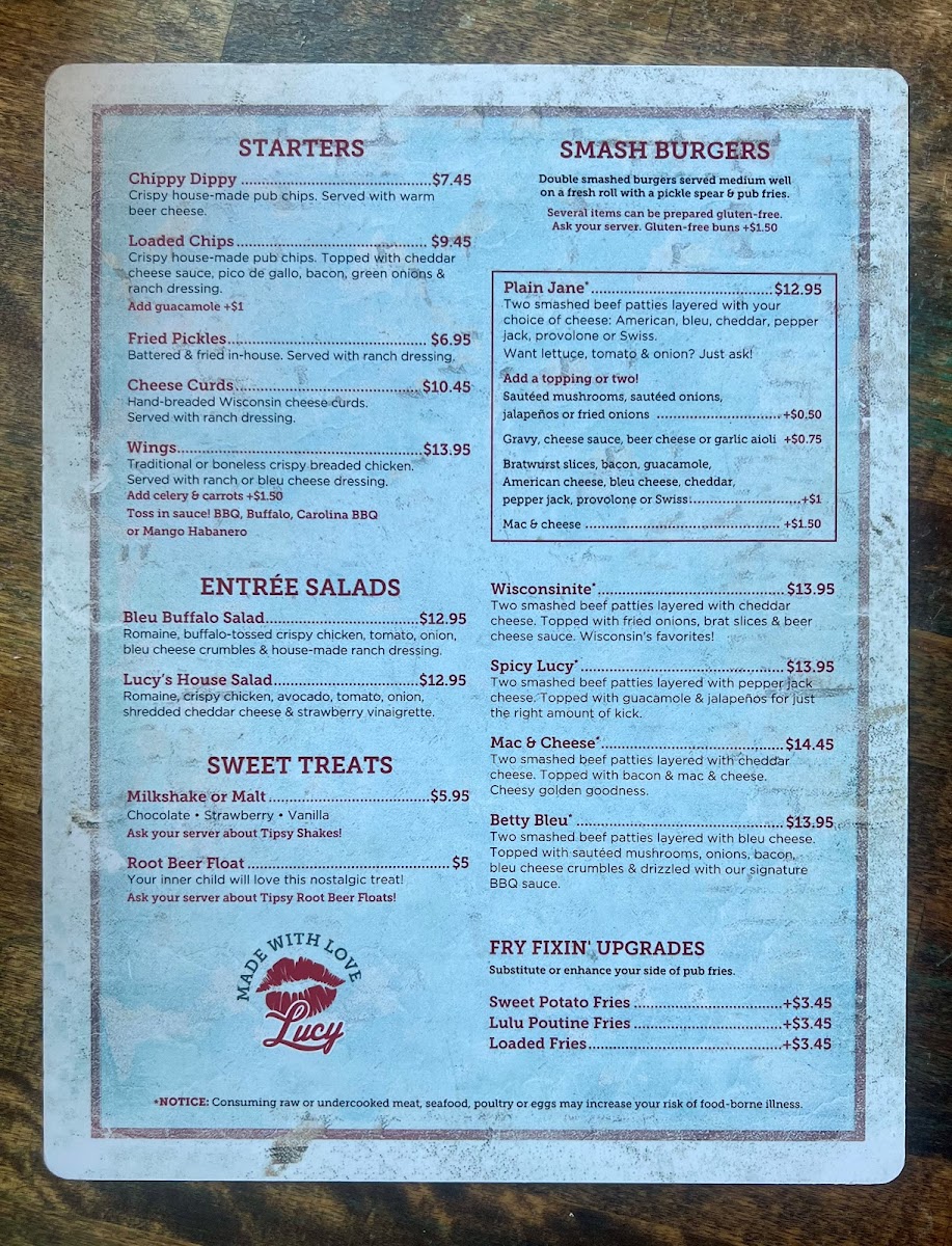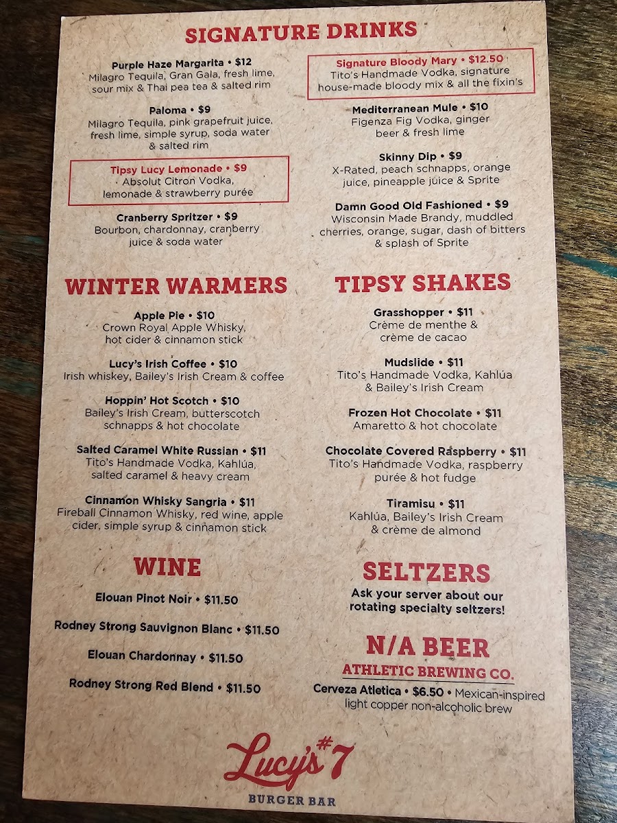 If you're craving delicious, mouth-watering burgers, look no further than Lucy's #7 Burger Bar Menu. Nestled in the heart of Beloit, WI, this cozy spot at 430 E Grand Ave serves up a variety of juicy burgers, each one packed with flavor and crafted from the freshest ingredients. Whether you're in the mood for a classic cheeseburger or something a little more adventurous, you'll find the perfect option to satisfy your hunger. Their extensive menu features a range of burgers, from traditional favorites to unique creations, alongside tasty sides that perfectly complement your meal. It's a great place to unwind with friends and enjoy a satisfying meal that hits the spot every time.