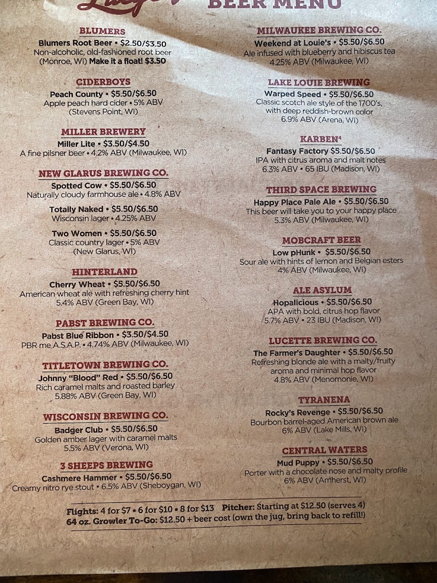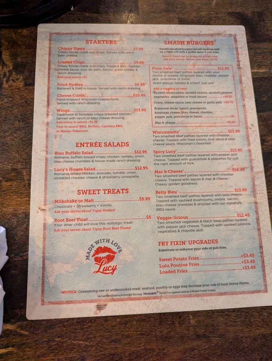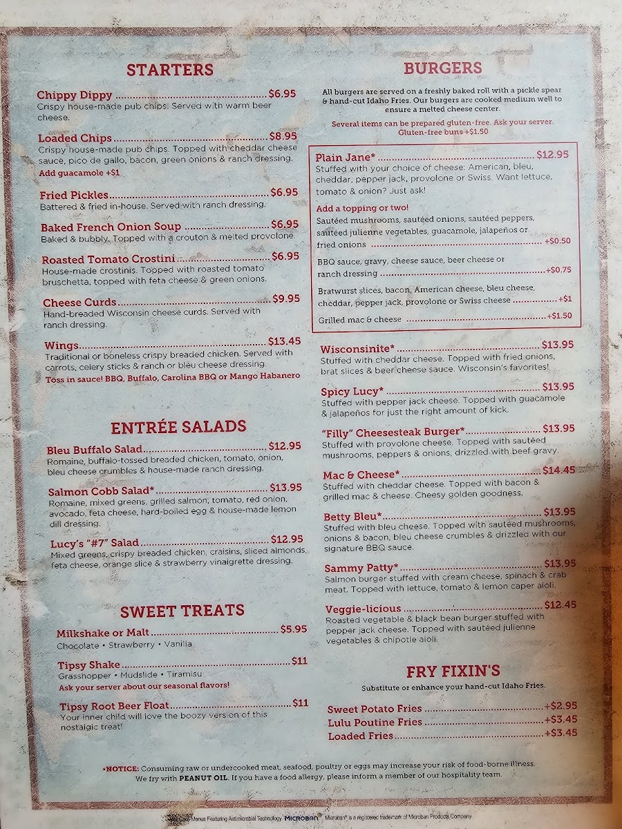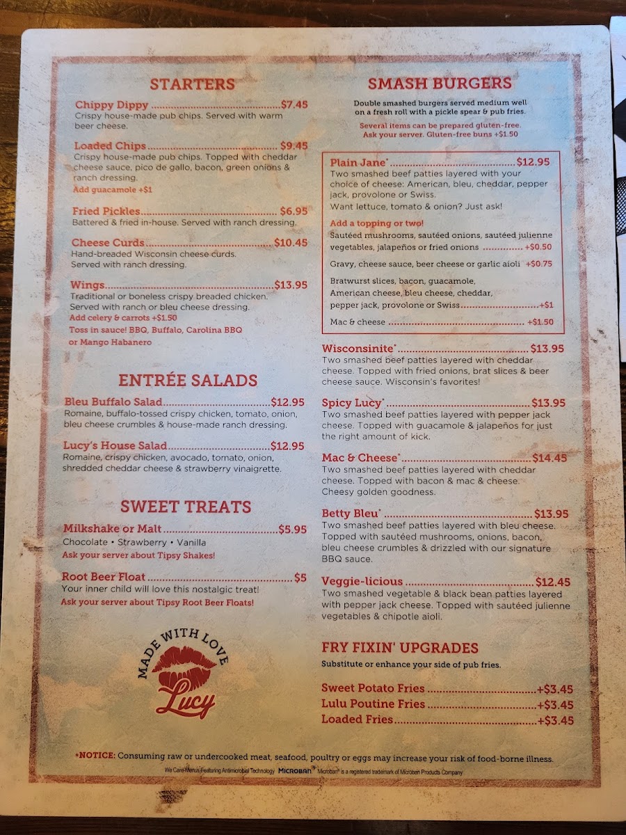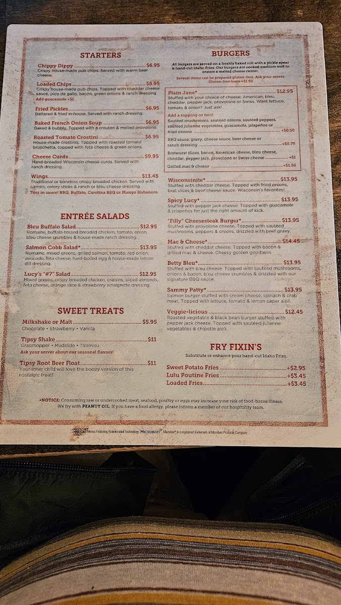 If you're craving delicious, mouth-watering burgers, look no further than Lucy's #7 Burger Bar Menu. Nestled in the heart of Beloit, WI, this cozy spot at 430 E Grand Ave serves up a variety of juicy burgers, each one packed with flavor and crafted from the freshest ingredients. Whether you're in the mood for a classic cheeseburger or something a little more adventurous, you'll find the perfect option to satisfy your hunger. Their extensive menu features a range of burgers, from traditional favorites to unique creations, alongside tasty sides that perfectly complement your meal. It's a great place to unwind with friends and enjoy a satisfying meal that hits the spot every time.